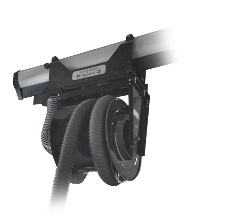In addition to the Vacuum Holster, Ascent Systems offers hosereels, which using a spring rewind mechanical to retract the exhaust hose around a drum. The hose reel can either be fixed-mounted with the service area, or it can be incorporated into an Apex Rail system, with moving hose reels.