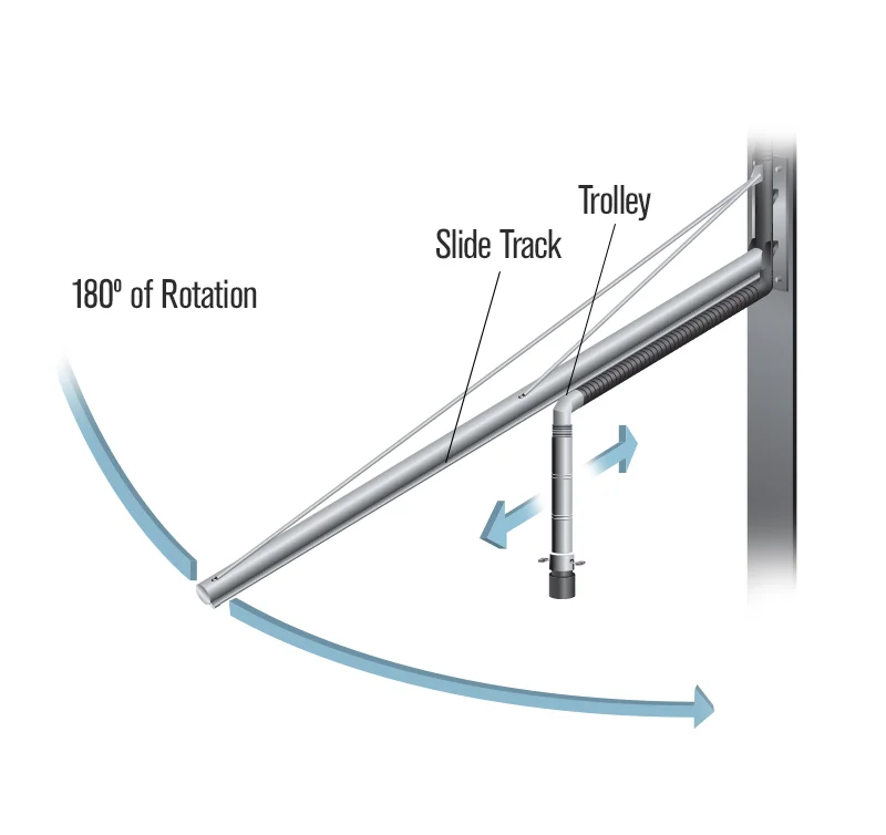 Ideal for service areas with bridge cranes, boom arms also provide easy placement and movement around parked vehicles, as well as an extended reach (up to a 40’ radius) of coverage. The Vacuum Holster (or conventional hosedrop) is mounted on a trolley that slides back and forth along the length of the arm. Standard arms lengths are 10’, 15’, and 20’.